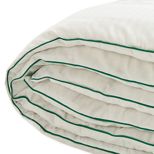 Одеяло выполнено из ткани 100 % хлопка сатин с тиснением страйп в белом цвете, отделка по краю кантом травяного цвета, фирменная упаковка.
